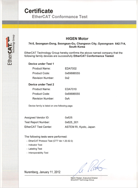 1328602280221.jpg2012년 1월 11일 국내 최초로 EtherCAT Conformance Test를 통과한 하이젠모터㈜는